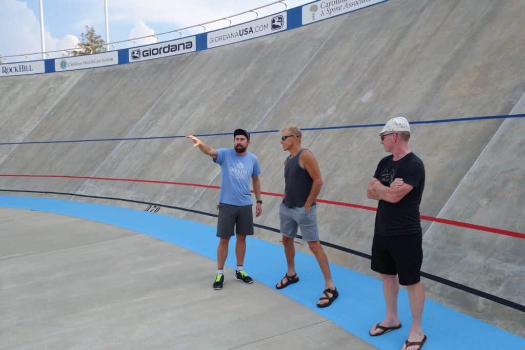 But before we get to that, I’ve got to tell you about our intermediate stop on the way into town, the Giordana Velodrome in Rock Hill, South Carolina. The City of Rock Hill (the home of Winthrop College) is 30 miles south of Charlotte and has shown great foresight in embracing cycling. Check out Bike Rock Hill and the Rock Hill Bicycle Club.