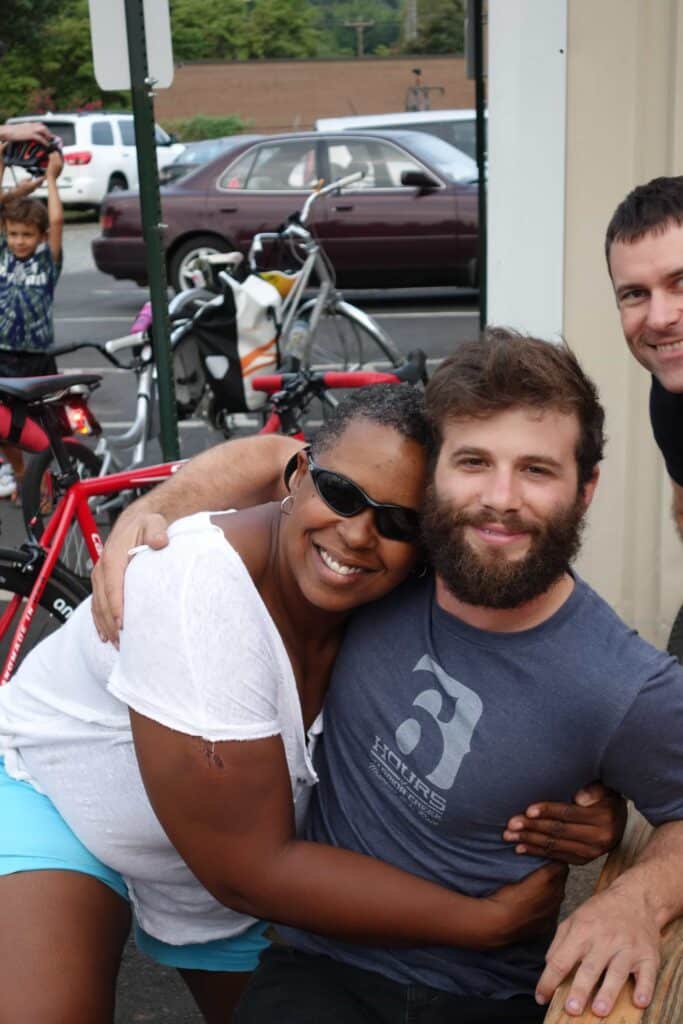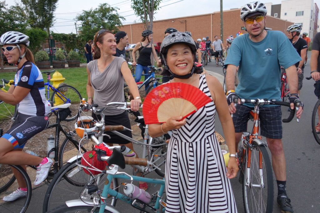 Pamela Murray (with fan) was instrumental in the organizing the ride. We profiled her in a previous blog post, so read more about her here. Thanks Pamela! Bike Law NC Ann Groninger is over her shoulder. The amazing turnout is a wonderful testament to her hard work in NC.