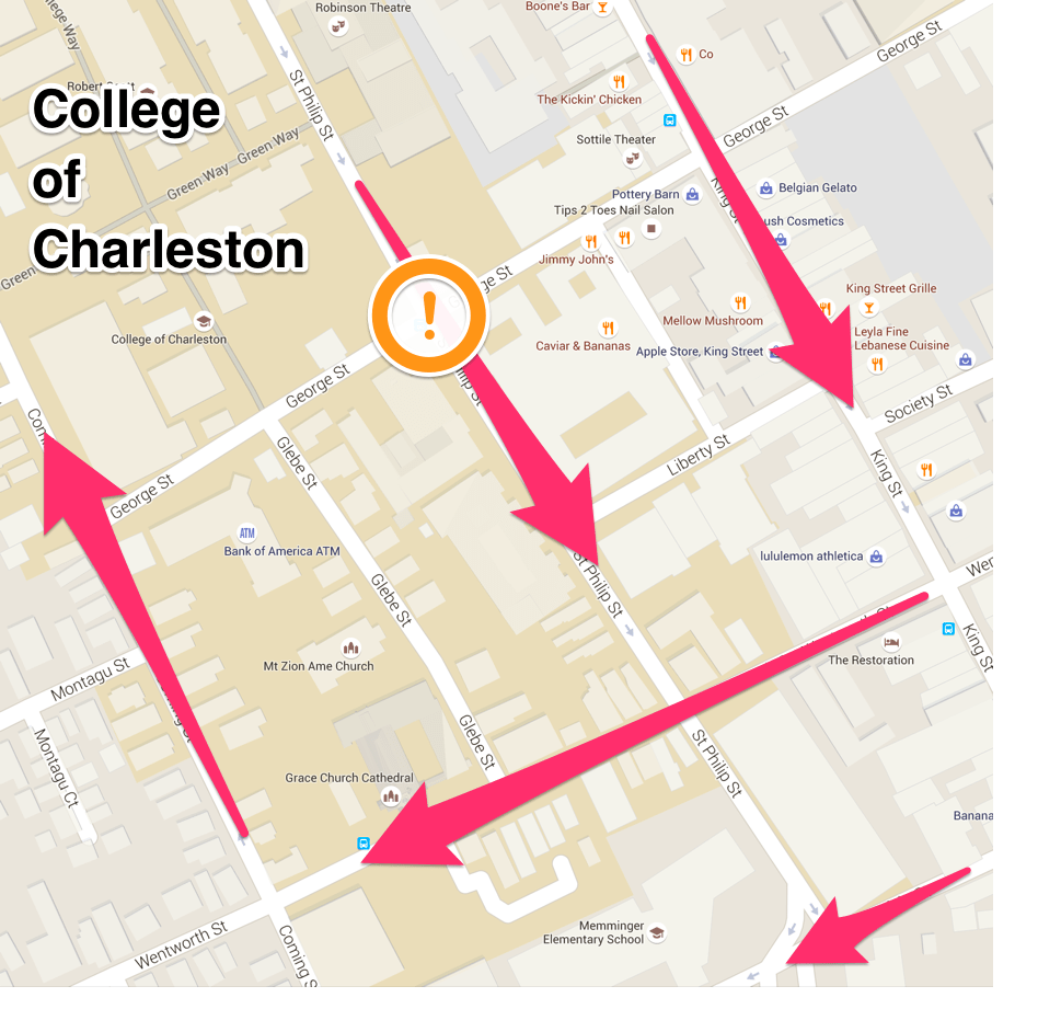 The cyclist in the video (who was cycling from one job to another) was riding against traffic on St. Philip (the exclamation point on the map). It’s against the law to do so. But students and others do it everyday, all day. We have worked with the Charleston Police Department to teach safe bicycling, but folks are going to continue to ride from Point A to Point B, especially when the legal route is unsafe. [As a commentator pointed out on Facebook, you can see at least two cyclists make improper turns in the video.]
