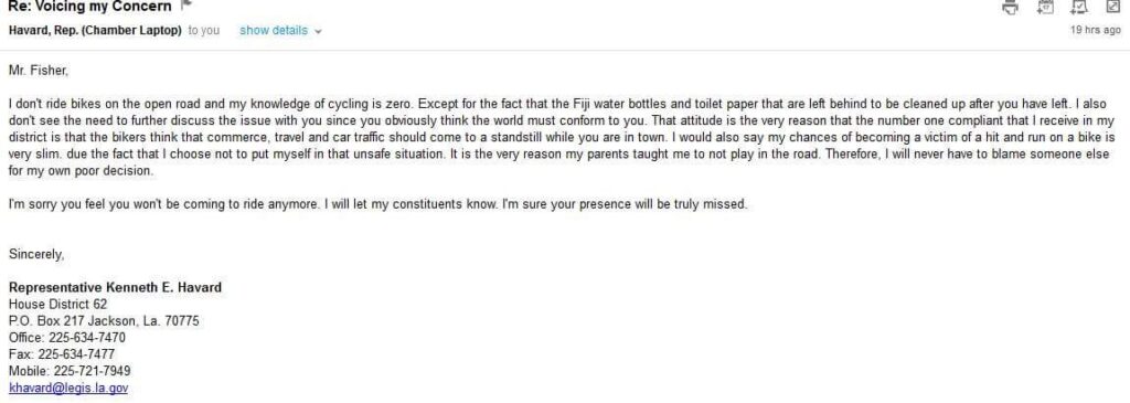 Fortunately, I’ve encountered nothing but considerate drivers while riding and racing my bicycle in this area of Louisiana for the last twenty years. Nevertheless, I dread the day that Rep. Havard drives behind me and must make the decision of whether or not to leave three feet of safe passage. I am, after all, offensive solely because I’m riding a bike. Today, Rep. Havard voted to kill this law based on his personal bias rather than the best interest of his constituents or the people of Louisiana. As a call to action, please contact Rep. Havard and provide input directly on his position ([email protected]).
