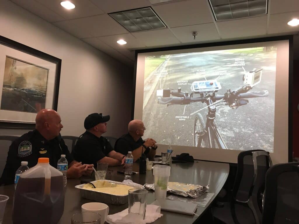 Bike Walk Knoxville and Bike Law Tennessee arranged for Chattanooga Police Officer Rob Simmons to come to Knoxville and give two presentations ahead of the USA Cycling national championships. Officer Simmons spoke to a group of KPD officers about his successful campaign, the Chattanooga Safe Cycling Initiative. The Initiative involves training officers and educating motorists and cyclists ahead of an enforcement campaign which uses a 3-foot detection device mounted on a bicycle along with officer’s observations as a basis to stop motorists who pass cyclists within three feet. Officer Simmons brought the beta model of the three-foot detection device manufactured by Codaxus with him to Knoxville and demonstrated how to use it for the KPD officers. Our own Bike Law Charlie did a great write up about Officer Simmons’ Safe Cycling initiative. Once officers have taken a mandatory training on Tennessee bike laws, and how to investigate wrecks involving bicycles, the materials are saved on their cruiser computers, so they can access the materials in the field. Officer Simmons can see when Chattanooga officers access the training materials in the field, and he reports that his educational materials are being used by Chattanooga officers who respond to bike crashes.