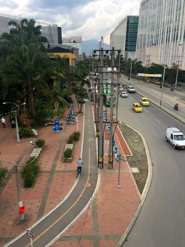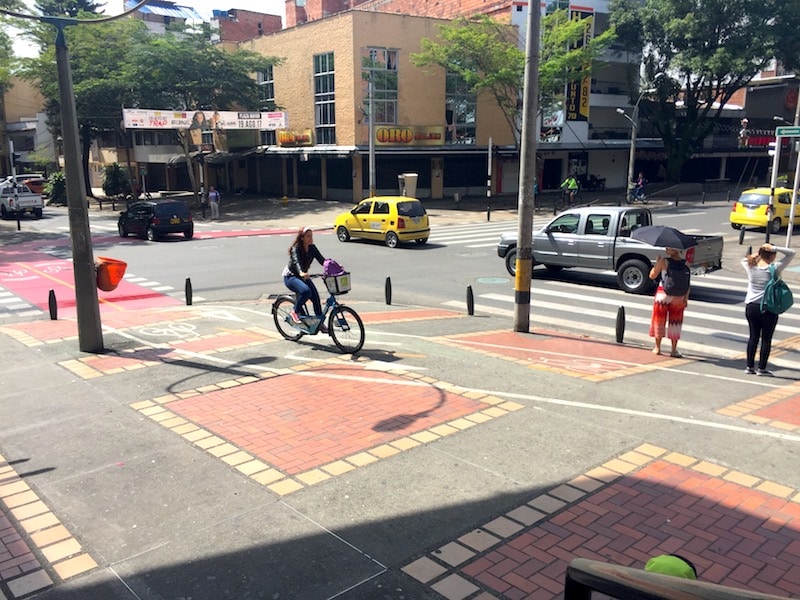 Protected intersections, such as the one shown below, are also commonplace in Medellín.