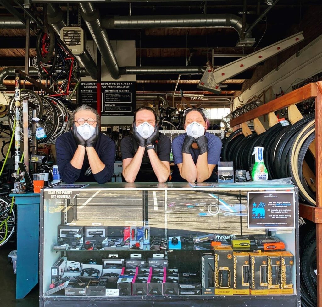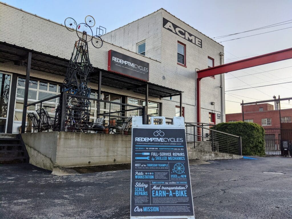 Redemptive Cycles is a bike shop with a non-profit community-focused mission. Its motto is “Redeem the Streets.” Its retail space is used for fundraising as the bike shop is first and foremost a charitable organization with a focused mission of “transportation equity” in Birmingham. Money spent on repairs or bike purchases is used to fund Redemptive’s Earn-a-Bike and Sliding Scale Repair programs benefiting local people who are experiencing homelessness and financial hardship.