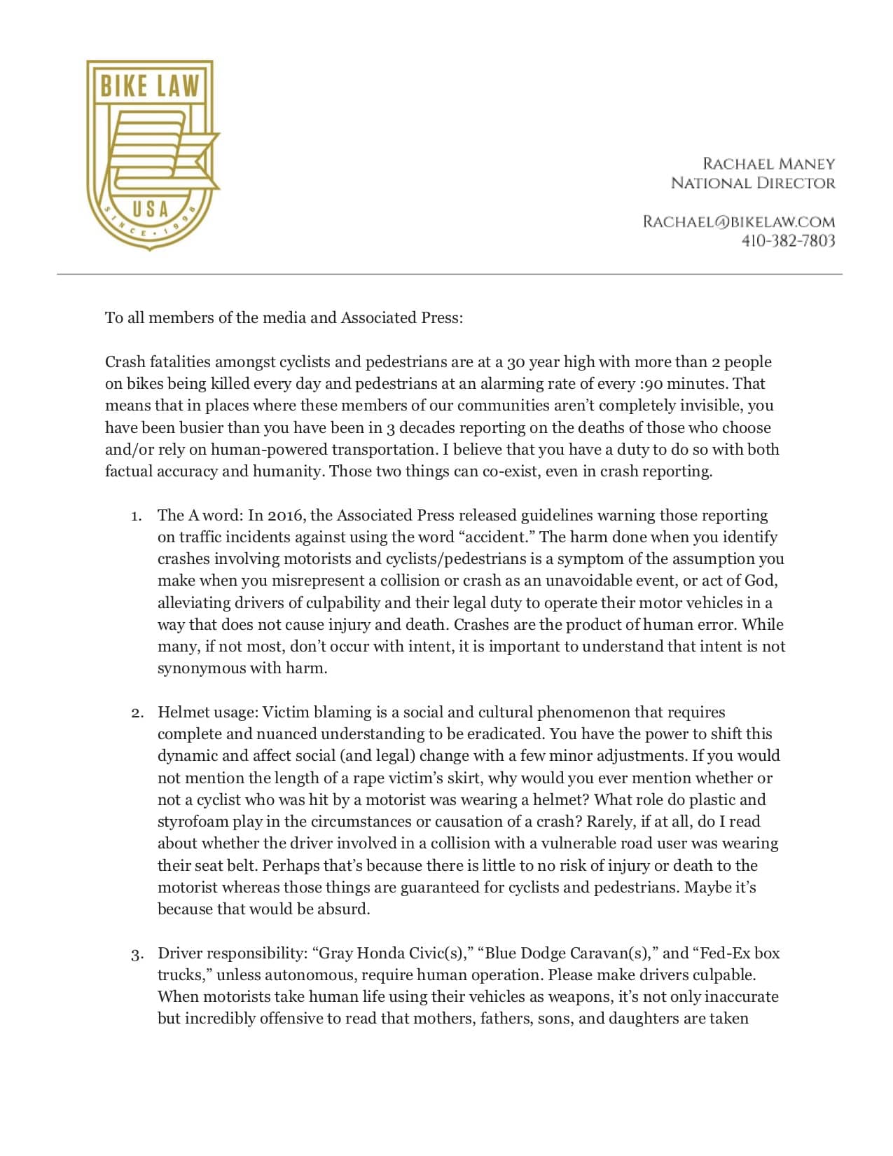 It’s Crash, Not the A-Word. CLICK HERE FOR .PDF OF THE LETTER. [CLICK AGAIN ON THE .PDF AFTER JUMP FOR DOWNLOADABLE VERSION] To all members of the media and Associated Press: Crash fatalities amongst cyclists and pedestrians are at a 30 year high with more than 2 people on bikes being killed every day and…